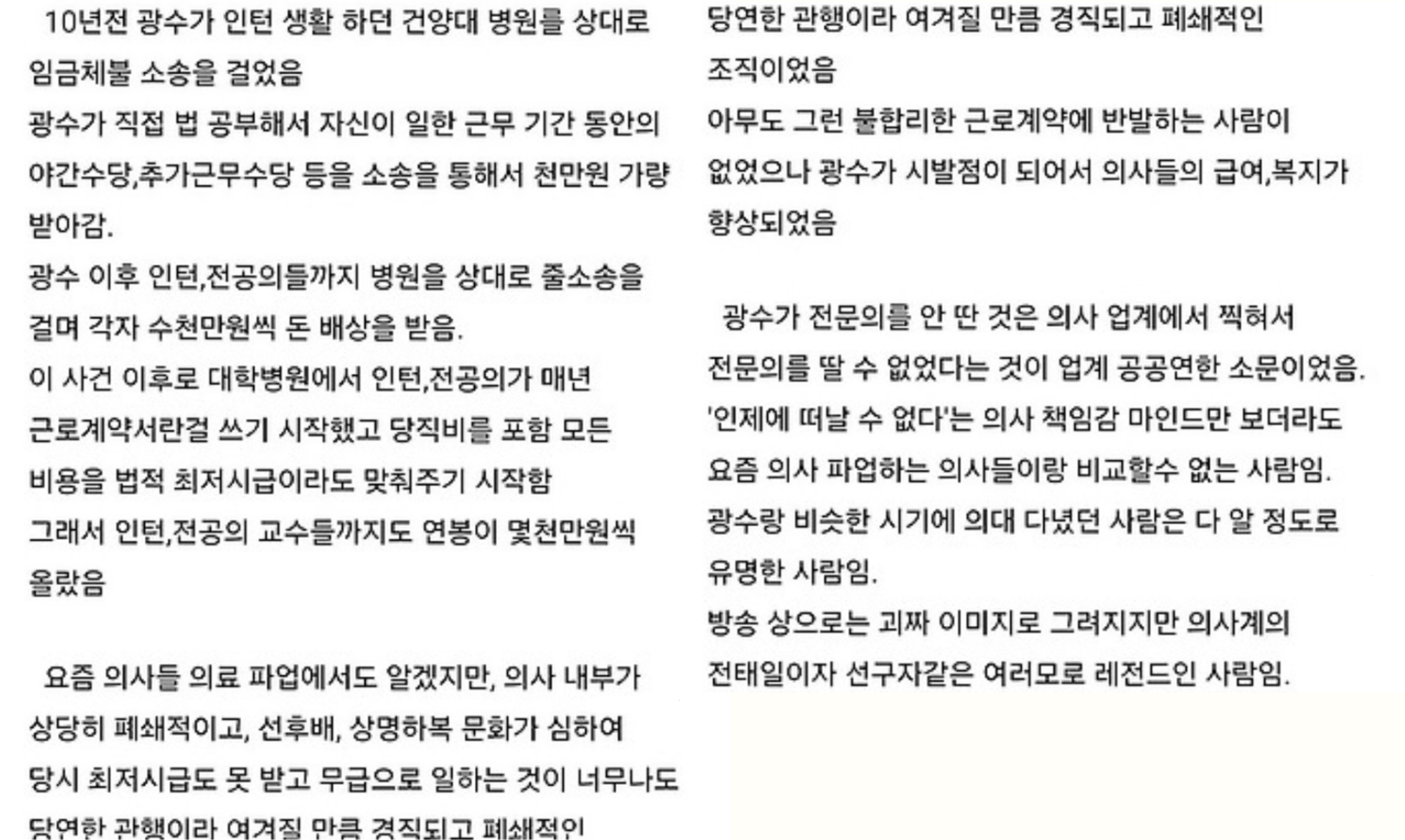 당시 인턴과 전공의들은 최저시급도 못 받는 환경이었는데, 광수는 이를 참지 소송을 한거죠. 법원은 그의 손을 들어주며 3,300만 원 지급을 판결했고, 이 사건은 의료계에 큰 파장을 일으켰습니다. 법학 석사 출신다운 논리와 실행력이 돋보였죠.